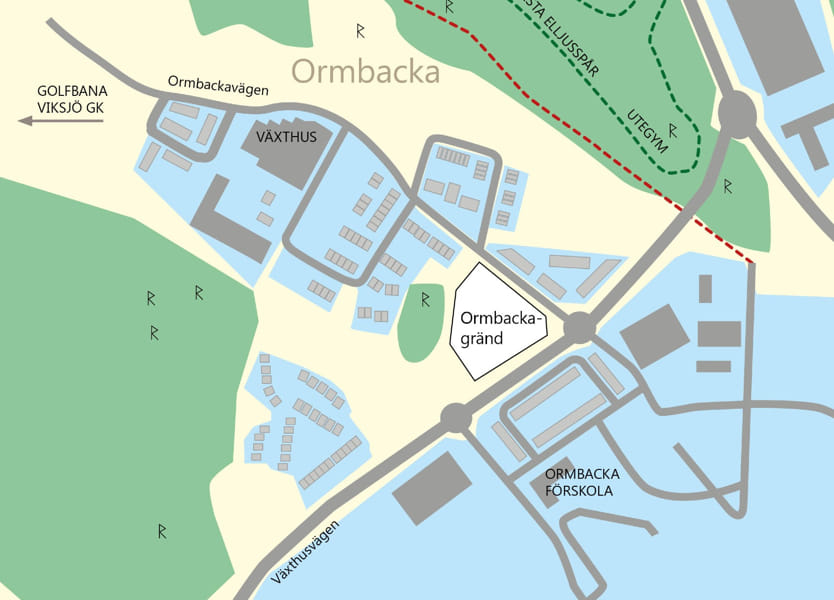 Ormbackagränd är ett litet, omsorgsfullt ritat kvarter med 25 radhus med äganderätt. Här ramar husen in en grön, trygg gård där cyklar står parkerade i klungor, barnen hittar varandra naturligt och grannar hejar med kaffekoppen i handen.